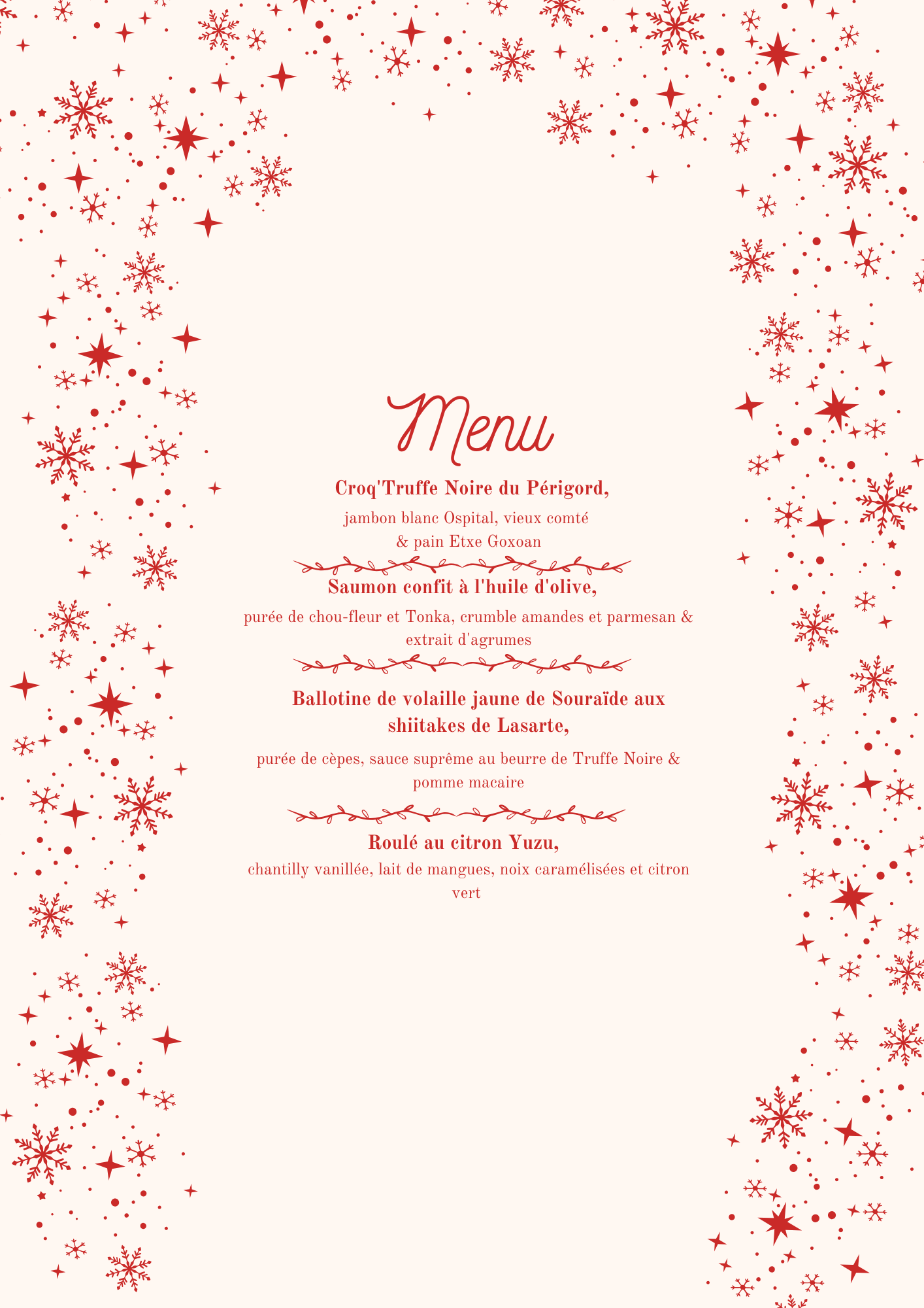 Croq'Truffe Noire du Périgord, jambon blanc Ospital, vieux comté et pain Etxe Goxoan Saumon confit à l'huile d'olive, purée de chou-fleur / Tonka, crumble amandes / parmesan et extrait d'agrumes Ballotine de volaille jaune de Souraïde aux shiitakes de Lasarte, purée de cèpes, sauce suprême au beurre de Truffe Noire et pomme macaire Roulé au citron Yuzu, chantilly vanillée, lait de mangues, noix caramélisées et citron vert